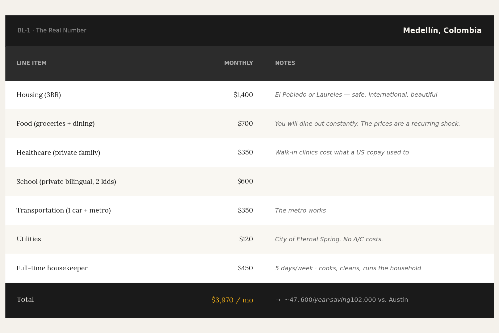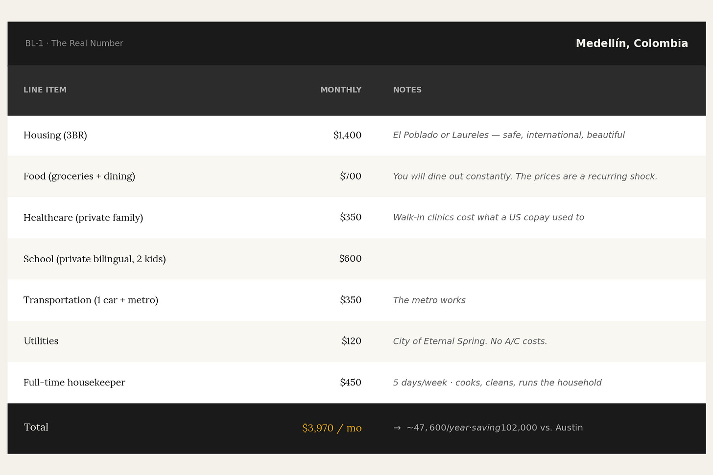 Some of it, however, is your own frame and your own positioning. Remote work is durable for a significant portion of knowledge work. Freelance and consulting income follows the person. And the arbitrage compounds: a family earning $100,000 remotely and spending $47,600 in Medellín is in a substantially better financial position than the same family earning $150,000 in Austin and spending all of it (and then some).