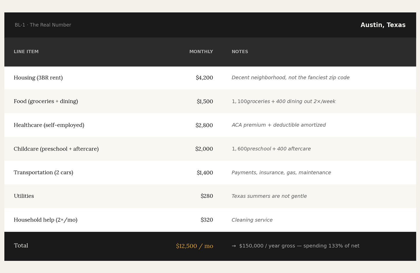 A family of four. Two working adults. Two kids, ages four and seven. A decent life — not lavish, not ascetic. The kind of life an American household earning $150,000 a year expects to be able to afford.